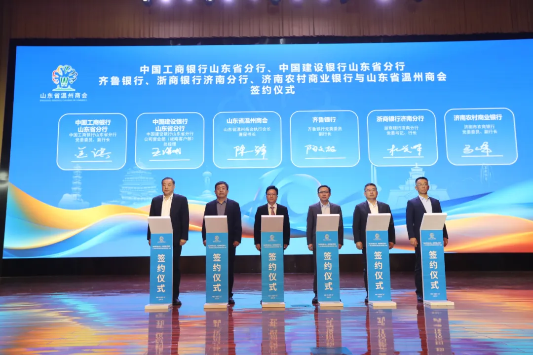 省温州商会与工行山东省分行、建行山东省分行、齐鲁银行、浙商银行济南分行、济南农商行五家金融单位进行战略合作签约。