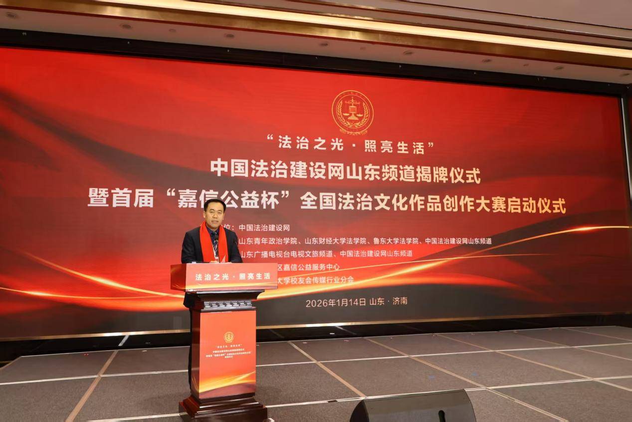 2026年1月14日上午,中国法治建设网山东频道揭牌仪式暨首届“嘉信公益杯”全国法治文化作品创作大赛新闻发布会在山东大厦齐鲁厅隆重举