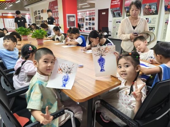 “绘出最美青花瓷”,青花瓷绘画区成了孩子们的“创意天地”。志愿者们先是通过图片和短视频,向孩子们介绍青花瓷的发展历程——从元代的粗犷大气到明清的精致典雅,从缠枝莲纹到云纹如意,一个个生动的故事让孩子们听得入迷。随后,白色瓷盘、蓝色颜料、细尖画笔依次分发,孩子们立刻化身“小匠人”,有的模仿传统纹样勾勒线条,有的发挥想象画出卡通形象,还有的在作品上写下自己的名字。“我要把画送给奶奶,告诉她这是中国的宝贝!”8岁的小明哲举着自己画的青花瓷作品,骄傲地向志愿者展示,蓝色的笔触虽稚嫩,却承载着对传统文化的好奇与热爱。