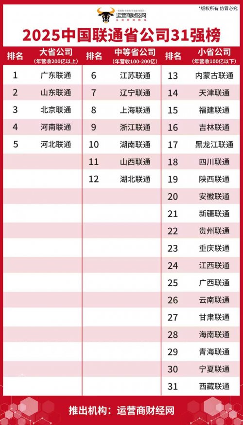 近期,运营商财经网独家编制的“2025中国联通省公司31强榜”名单正式公布,每一家省公司都依照客观的经营数据进行了排名,结果令人意想不到。