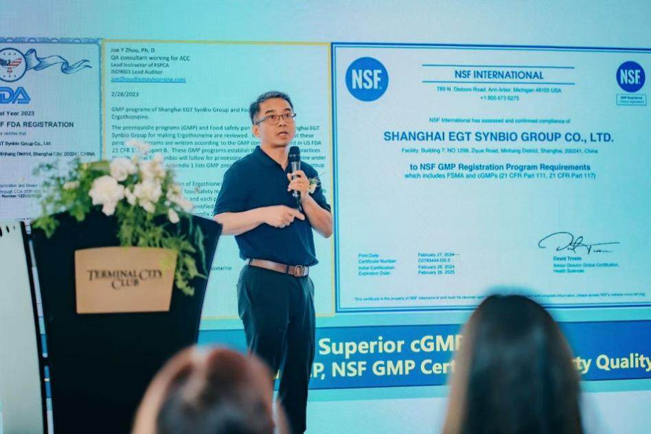 主办方同时邀请来自上海EGT Synbio集团易林博士作主旨演讲。易林博士代表上海EGT Synbio集团 介绍了集团专利原料 Dr.Ergo® 麦角硫因 的突破性成果——其纯度高达 99.9%,在安全性与稳定性方面均达到国际领先水准。值得一提的是,该产品已在 GRAS Associates 的支持下,获得美国食品药品监督管理局(US FDA)出具的“无异议”函(GRN1191),正式确立了其 GRAS(一般公认安全) 地位。易林博士同时分享了两项人体实验数据,并介绍了集团独家研发的 全酶法发酵工艺(Patented and Unmatched Full Enzymatic Fermentation Process)。