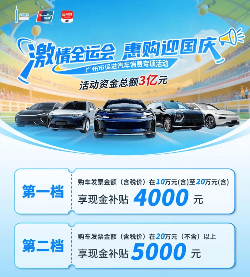 随着车市进入“金九银十”传统旺季,广州将于9月15日至30日,推出“激情全运会 惠购迎国庆”购车专项补贴,全国个人消费者在广州合规车企购车,至高可享5000元现金补贴,活动补贴总额达3亿元,先到先得、用完即止。