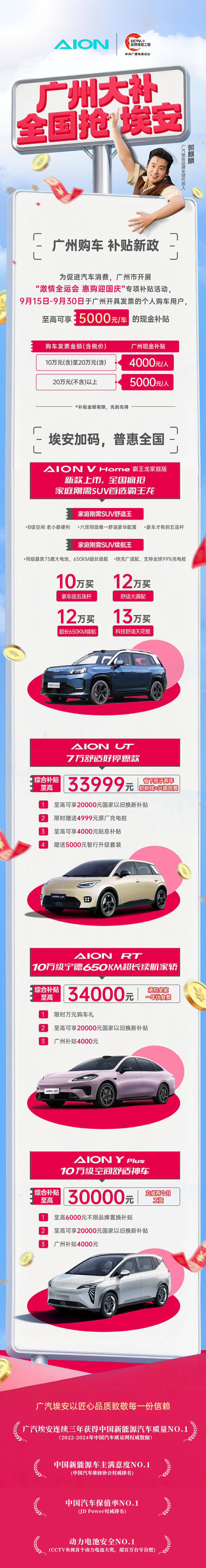 作为大湾区新能源汽车领军企业,广汽埃安积极跟进广州新政,在政府补贴与平台权益基础上,额外推出原厂充电桩赠送、金融贴息、专属置换补贴等福利,叠加国家相关补贴至高可享3.4万元综合补贴。旗下车型涵盖AION RT、AION UT、AION Y Plus,以及新晋上市的“家庭刚需 SUV 首选”埃安霸王龙家庭版,满足不同用户的多样化需求。