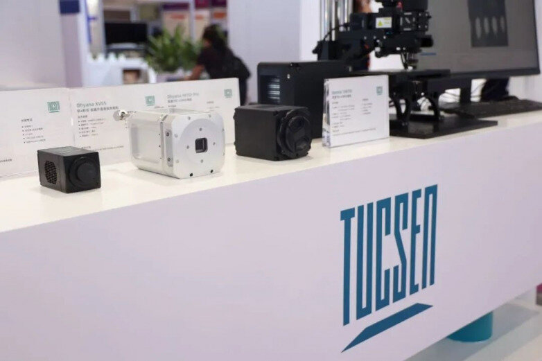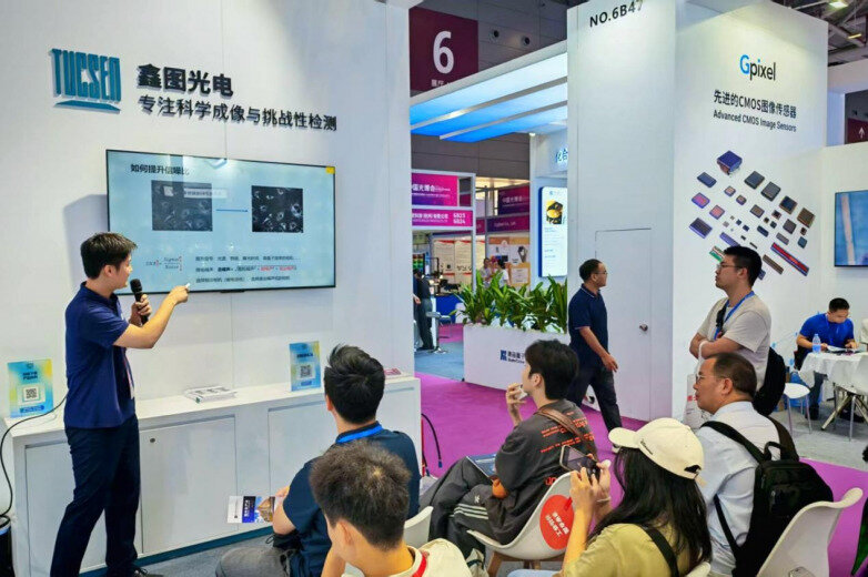 鑫图光电此次展出的产品矩阵彰显出强劲的“鑫”实力。其中,大靶面高灵敏相机系列表现尤为突出:Aries6510搭载背照式sCMOS芯片,具备29.5mm超大靶面,一千万像素下全幅帧率高达150fps,峰值量子效率达95%,读出噪声低至0.7e-,尤其适用于光片显微镜、超分辨成像等高速高灵敏生物应用场景;Leo3243则拥有31mm靶面与4300万像素,全幅帧率达100fps,在极高数据通量下仍保持80%以上峰值QE和仅2e-的读出噪声,堪称新一代高通量应用的理想之选;而Leo5514作为大靶面全局快门相机,凭借5.5μm像素、1400万像素分辨率与最高670fps的拍摄速度,在飞拍及弱光成像中表现卓越。