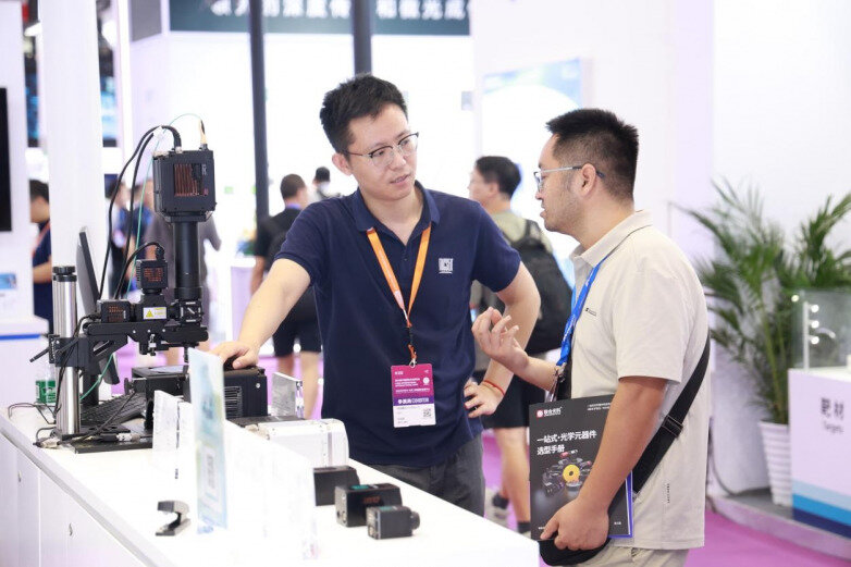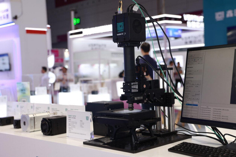 同期展示的16KTDI相机,分辨率达16416,支持500kHz@16K行频,具备256与32级TDI模式,覆盖180–1100nm波段,266nm处QE不低于50%,支持风冷/水冷,为超高分辨率检测提供更多选择。