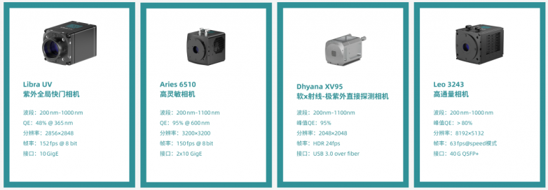此外,Libra UV紫外全局快门相机与专为软X射线及极紫外优化的Dhyana XV95同样吸引众多专家驻足。Libra UV覆盖200–1000nm波段,在365nm处量子效率达48%,分辨率为2856×2848,帧率152fps@8bit,配备10 GigE接口;Dhyana XV95则在80–1000 eV能段实现超过90%量子效率,部分波段逼近理论极限。