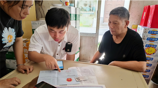 图为稽查员曾德聪指导零售户线上办理许可证延续业务(许德浪 摄)