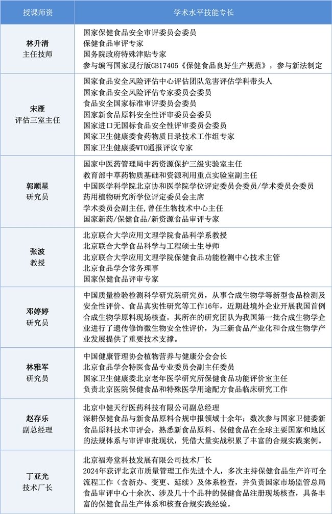 本次培训亮点显著:一是特邀林升清、宋雁等国家市场监管总局、国家卫健委、国家食品安全风险评估中心一线权威专家及企业代表面授,提供“理论 + 技能 + 经验 + 实操”全方位指导;二是安排行业实战企业分享成功案例,提供可落地的操作指南;三是采用2天线下面授形式,课程兼顾理论与实践,设置互动问答环节,提升学习效率。