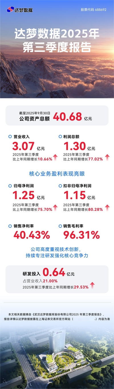 报告数据显示:截至2025年9月30日,该公司资产总额达40.68亿元。本报告期内,企业实现营业收入3.07亿元,较上年同期增长10.66%。在盈利方面,多项核心数据表现突出:利润总额1.30亿元,比上年同期增长77.02%;归母净利润1.25亿元,比上年同期增长75.70%,扣非归母净利润1.15亿元,比上年同期增长80.28%。值得注意的是,2025年第三季度达梦数据销售净利率与销售毛利率分别为40.43%和96.31%,表现出较强的盈利能力。在业务稳健发展的同时,企业持续加大研发投入。本报告期内,研发投入合计0.64亿元,占营业收入比例为21.00%,比上年同期增长29.53%。表现出企业对技术自主创新的高度重视。当前,随着社会数字化、信息化程度不断深化,各行业数智化转型进程持续加速。面对这一趋势,达梦数据表示将持续聚焦自主研发与原始创新,通过强化核心竞争力,推动企业实现健康可持续发展,为各方创造更多价值。