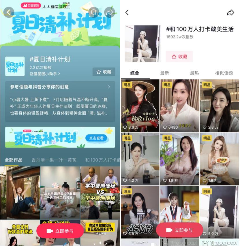 在明确场景策略后,活动发起#夏日清补计划 主话题,配合搜索阿拉丁、开屏等资源,将分散的流量汇聚成统一的趋势声量。与此同时,#和100万人打卡敢美生活 等品牌话题同步上线,实现了IP声量与品牌曝光的双向导流。