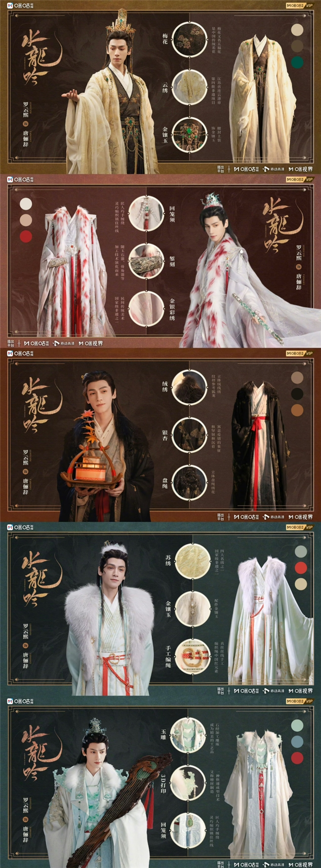 《水龙吟》以“金、赤、玄、白、绿”五大主色为核心,构建起完整的视觉表达体系。剧中,金色延续了古代沥粉贴金工艺的华贵气质,通过主角服饰的细腻纹样与场景设计,展现出超越世俗的神性光辉。这种设计理念源于中国古代对“金”的崇拜,既体现了五行之金的坚不可摧,也象征着日月光华的神圣气质。