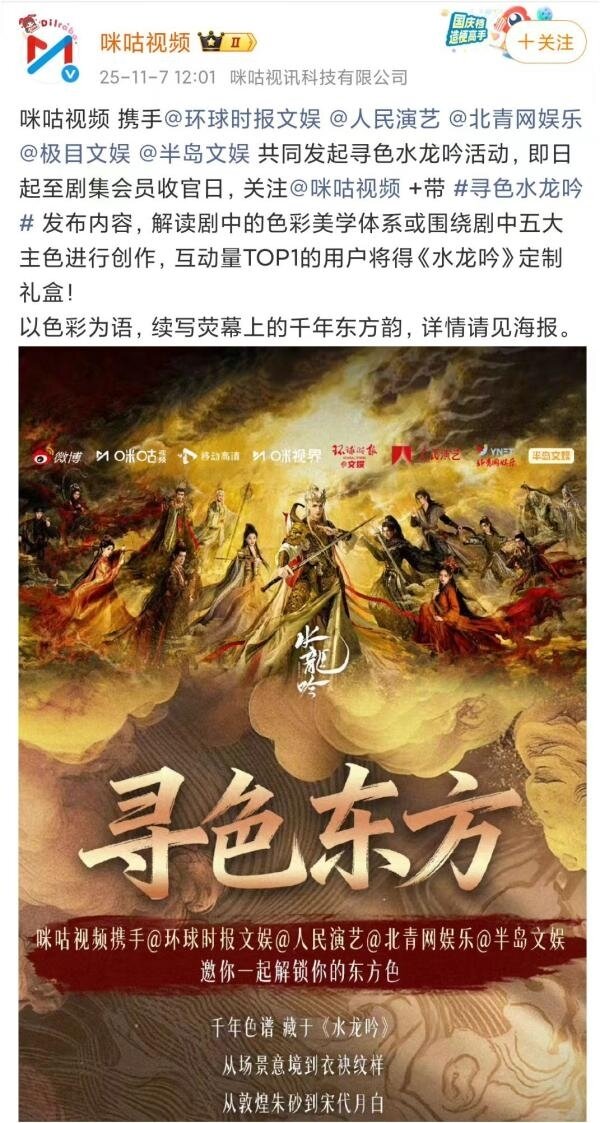 在剧集热播期间,咪咕视频联合环球时报文娱、人民演艺、北青网娱乐、极目文娱、半岛文娱等多家权威媒体,共同发起#寻色水龙吟# 美学企划活动,以色为媒,引导公众探寻东方色谱的当代诠释。这场活动在社交平台引发热烈讨论,形成了多层次的美学对话。