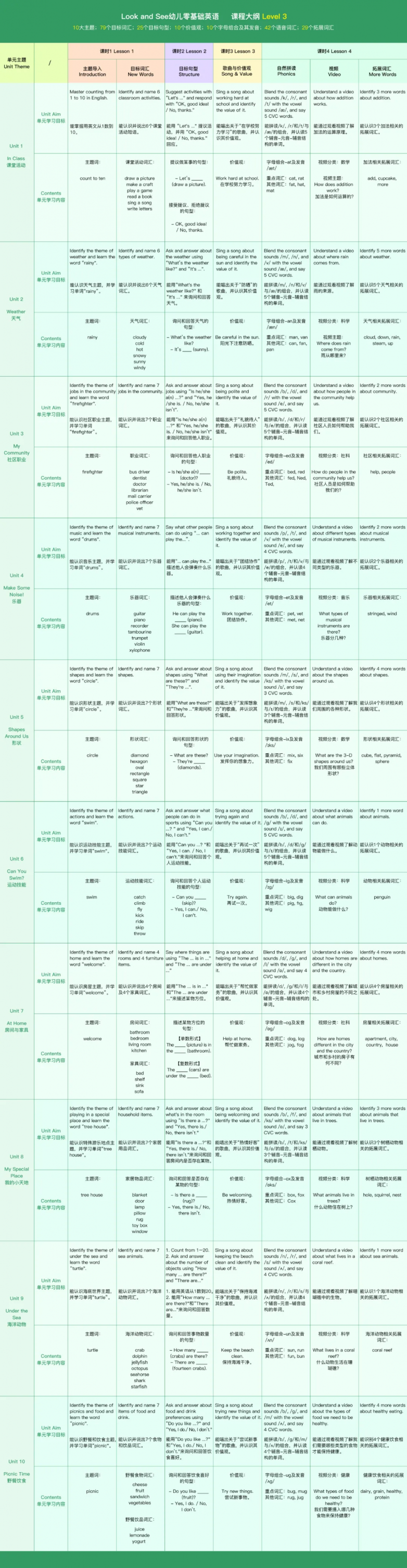 常用课堂指令、单元主题词、目标词汇、目标口语句型、字母及发音/数字/自然拼读