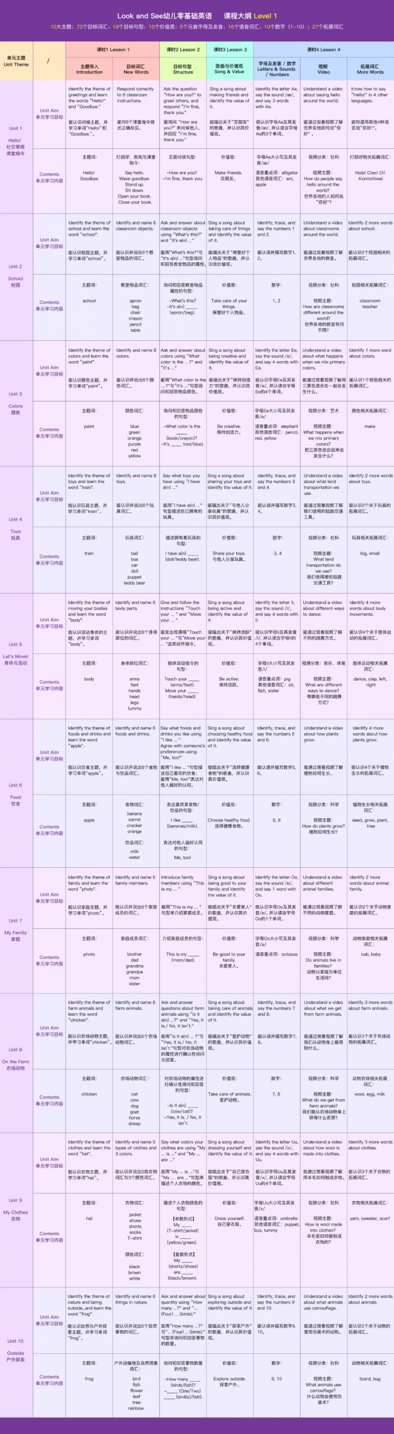 单元主题导入、词汇、句型、歌曲和价值观、字母及发音/数字/自然拼读、视频