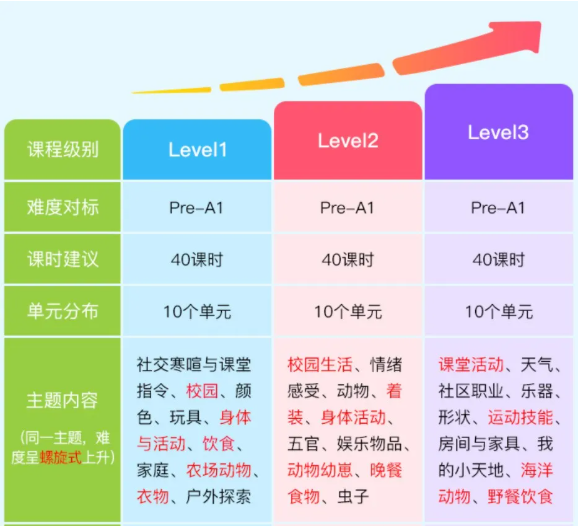 课程分为3个循序渐进级别,融合符合低龄学员的认知水平的目标语言和品格素养主题。