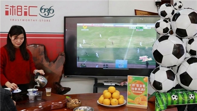 说干就干。在宜章县局(分公司)的协助下,店铺的大堂被改造成“湘超观赛角”,来来往往的游客可以直接观看到大屏,音响里传来解说员激昂的声音。马毛音还特意陈列一座第一名奖杯气球,摆在电视机旁。“摆设这个奖杯,是希望我们郴州队能一路披荆斩棘、勇夺第一。”她望着奖杯,闪烁着球迷特有的热忱。