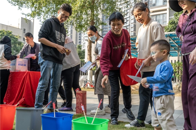 活动以“桶边督导”实践环节拉开序幕,志愿者身着统一服装,手持实物样本向居民细致讲解分类要点,并开展“分类问答”互动,现场抢答踊跃,知识深入人心。随后进入趣味游戏环节,“套圈认垃圾”和“投壶分品类”吸引居民纷纷参与,大家在欢声笑语中巩固分类认知——从小朋友准确说出“快递盒是可回收物”,到居民热烈讨论“过期化妆品是有害垃圾”,分类知识在游戏中悄然传递。活动最后还设置了积分兑换小礼品环节,以轻松有趣的方式进一步激发了居民的参与热情。