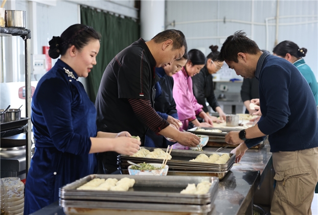 节日搭台,让文化在互动中交融。2025年春节的公司食堂,热气氤氲、笑语喧阗。中方员工手把手教蒙方同事包饺子,蒙方员工阿扎攥着圆滚滚的饺子皮,小心翼翼舀起馅料,却因贪心放多导致面皮“笑开了花”,他吐了吐舌头露出腼腆笑容,中方师傅桂安民笑着递过新皮:“别急,包饺子就像处朋友,诚心最重要!”另一边,蒙方员工扎雅带着铜壶、炒米和黄油,现场演示蒙古奶茶的地道做法,“火候要稳,奶与茶的比例得刚好,再撒一把炒米才够香!”。在那达慕大会的草原上,《吉祥三宝》的悠扬旋律与《茉莉花》的清雅曲调交替响起,台下观众不分国别,跟着节奏拍手应和,不同文化的音符在此刻奏响跨越国界的和谐乐章。