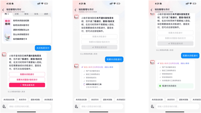 支付功能管理:需要关闭极速付、免密支付等服务时,输入关键词即可直达操作,无需理解专业术语,验证流程简单直观。