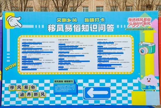 现场设立的移风易俗主题互动体验区人气吸引了众多群众积极参与。政策宣传内,村民认真翻阅宣传册、咨询讨论,加深对相关政策的理解;非遗展示区通过精巧手工艺作品,让群众在审美体验中感悟传统文化中崇俭尚德的理念;“新风承诺签名”“文明谜语竞猜”等互动环节,则以轻松有趣的形式引导群众作出文明承诺、学习新风知识。此外,旧物改造、知识问答、暖心茶摊等特色活动,也让群众在参与中有所得、有所感。