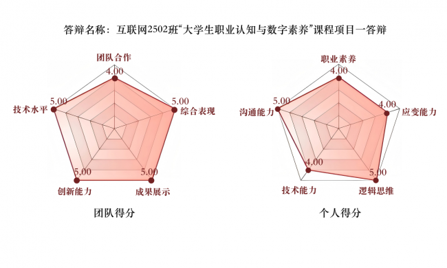 双维雷达图评价体系。芯云学院开发了“学生课程与综合能力评价系统”,实施课程“小组+个体”双维度评价。团队维度设定团队合作、技术水平、创新能力、成果展示、综合表现5个一级指标和25个观测点,个人维度设定职业素养、沟通能力、技术能力、逻辑思维、应变能力5个一级指标和25个观测点。本课程三个项目按20%:30%:50%设权重,每个项目均以小组展示答辩方式评价。学生课程最终成绩按小组60%:个体40%权重折算。各项目小组答辩成绩、学生课程成绩均采用“星级评分制”(最高5颗星)生成雷达图,直观呈现小组、个体的学习效果。