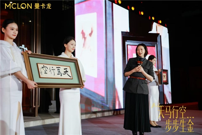 在真迹震撼之余,文化赠送仪式温情启幕。徐悲鸿美术馆馆长杨净将徐悲鸿之子徐庆平先生,亲手题写的“天马行空-马年春联” 手书捐赠给曼卡龙品牌,笔墨传递昂扬精神,也见证三方的深厚情谊,曼卡龙珠宝股份有限公司董事长孙松鹤现场致谢。