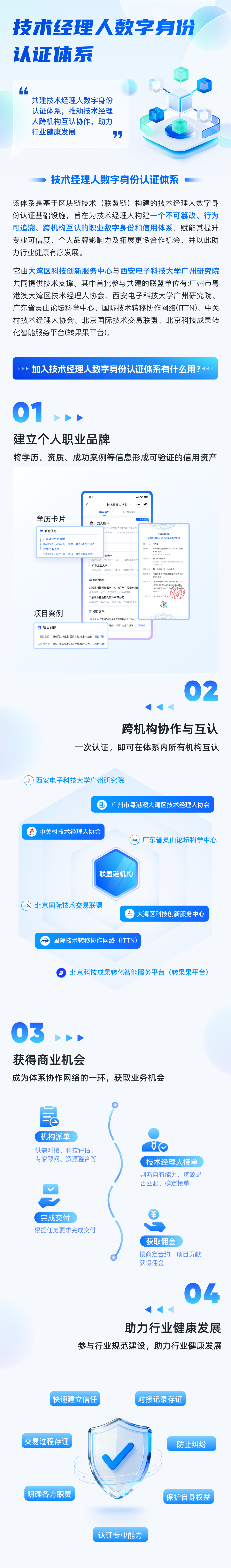 技术经理人数字身份认证体系由大湾区科技创新服务中心与西安电子科技大学广州研究院联合提供技术支撑,汇聚了广州市粤港澳大湾区技术经理人协会、西安电子科技大学广州研究院、广东省灵山论坛科学中心、国际技术转移协作网络(ITTN)、中关村技术经理人协会、北京国际技术交易联盟、北京科技成果转化智能服务平台(转果果平台)、汤逊湖科技创新中心等单位参与共建,为技术经理人行业数字化、规范化发展按下了“加速键”。
