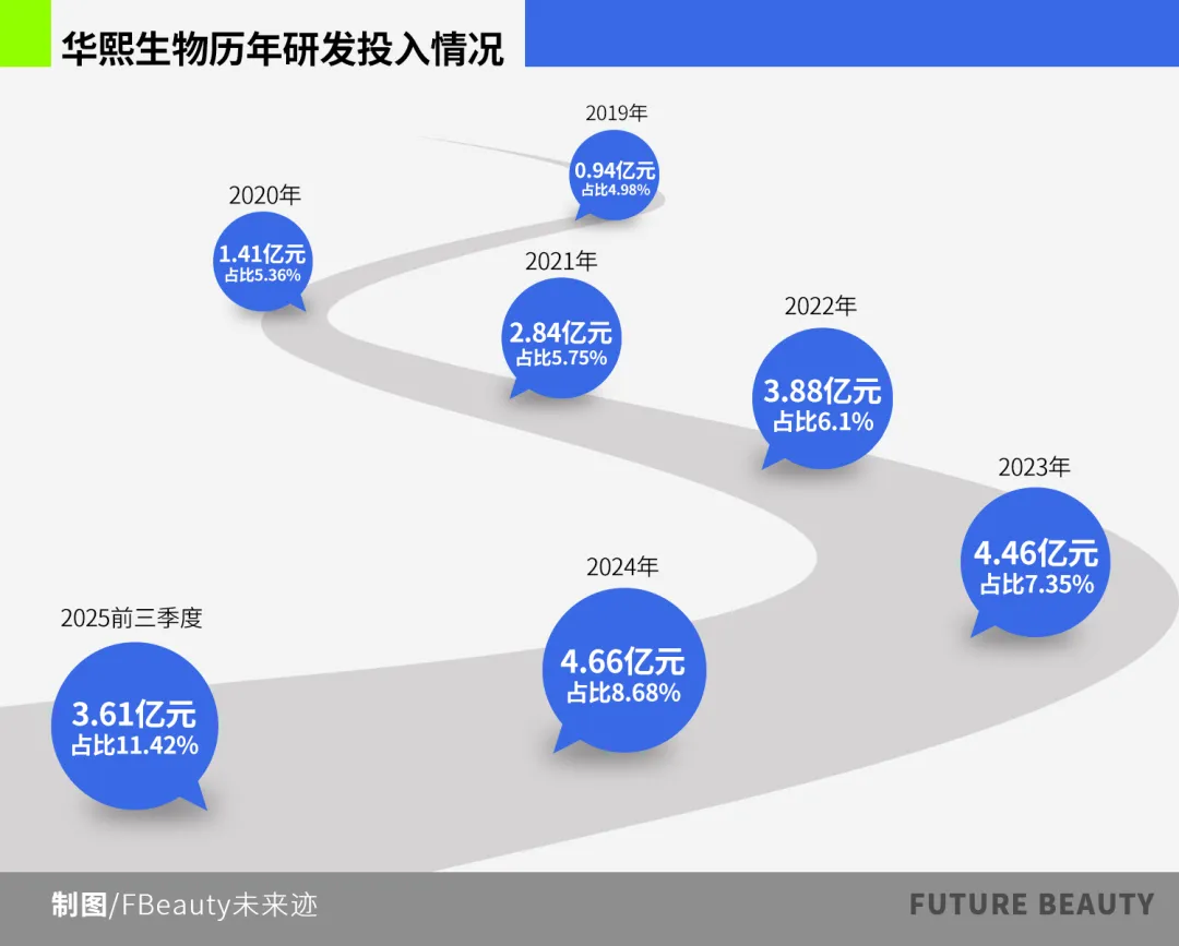 与许多企业在行业承压时选择收缩不同,华熙生物在过去几年里始终保持着对研发的稳定投入节奏。自2019年科创板上市至2025年上半年,华熙生物累计研发投入已超过22亿元。在健康消费品领域,这一投入规模长期处于行业前列,且连续多年维持高位。