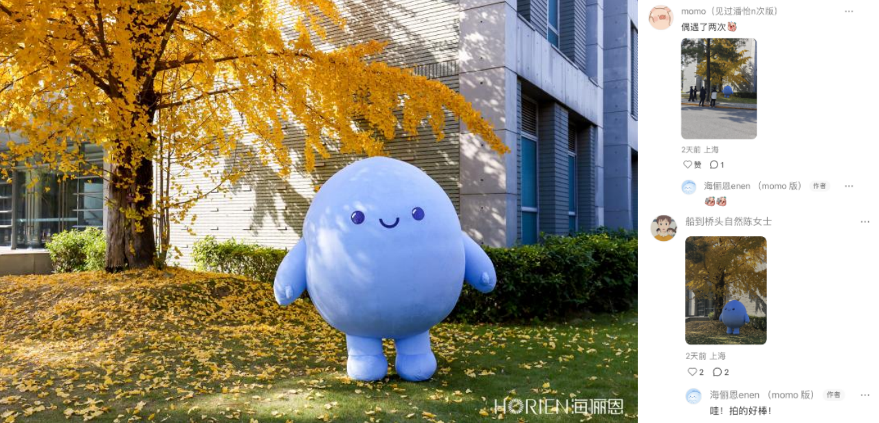 这一逻辑在同济大学的银杏树下,得到了最生动的验证。当圆滚滚的“恩恩”现身银杏大道上,不少认出它的学生们自然而然举起手机围上去,主动和它“集邮”合影,或是为它拍下各种可爱的照片。更有趣的是,当品牌在社交平台分享“恩恩”的同济游记时,许多同学也在评论区纷纷晒出自己手机里的“站姐”视角。一来一往之间,活动还未开始,品牌和学生已经完成了一次温暖的隔空互动。
