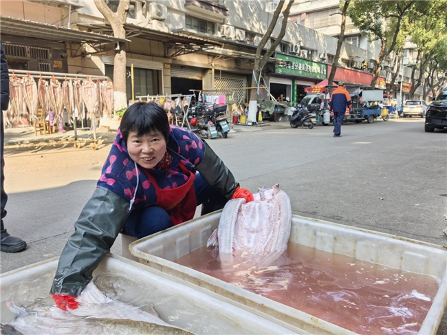 图为谢兴德妻子帮忙清洗鲜鱼