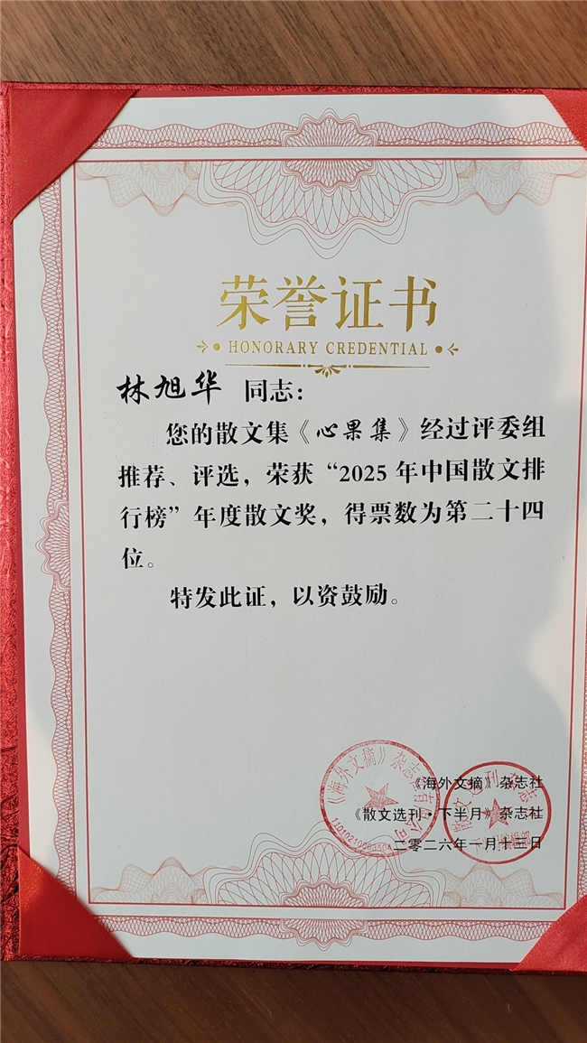 林旭华《心果集》荣登2025年度中国散文排行榜榜单,与著名作家刘庆邦、阿成、梁晓声等作品一起同榜,是林旭华散文创作生涯的一个重要里程碑。