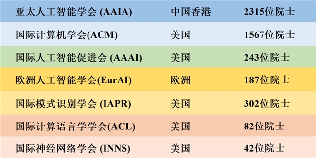 亚太人工智能学会(Asia-Pacific Artificial Intelligence Association)于2021年在香港注册成立。亚太人工智能学会(AAIA)是由全球2315位院士以及24万会员自愿组成的学术性、非营利性、非政府性组织。亚太人工智能学会(AAIA)的院士来自麻省理工大学、斯坦福大学、剑桥大学、牛津大学、慕尼黑工业大学、多伦多大学、悉尼大学、东京大学、新加坡国立大学、清华大学等知名大学,以及来自微软、谷歌、苹果、高通、英伟达、Meta、Intel、IBM、三星、华为等全球知名高科技公司的人工智能领域的世界顶尖科学家。亚太人工智能学会(AAIA)会士包括各国院士(如美国科学院院士、美国工程院院士、欧洲科学院院士、中国科学院院士、中国工程院院士、加拿大工程院院士、英国皇家工程院院士、新加坡工程院院士等)、国际电子电气工程师学会会士(lEEE Fellow)、国际计算机学会会士(ACM Fellow)、国际人工智能促进会会士(AAAI Fellow)、国际模式识别协会会士(IAPR Fellow)等。AAIA现有会员总共24万人,AAIA现有院士总共2315人,其中诺贝尔奖得主2人、ACM图灵奖得主3人、美国国家科学院院士30人、美国国家工程院院士80人、英国皇家工程院院士46人、英国皇家科学院院士33人、德国国家科学院院士18人、德国国家工程院院士18人、法国科学院院士11人、中国科学院院士23人、中国工程院院士24人、日本工程院院士33人、韩国国家工程院院士15人、韩国科学院院士25人、澳大利亚科学院院士9人、澳大利亚工程院院士11人、加拿大皇家科学院院士32人、加拿大工程院院士75人、荷兰皇家科学院院士14人、欧洲科学院院士222人及其他发达国家院士、以及1545位IEEE会士、249位ACM会士、93位AAAI会士、68位EurAI会士、144位IAPR会士、22位ACL会士、18位INNS会士及其他知名国际组织会士等。