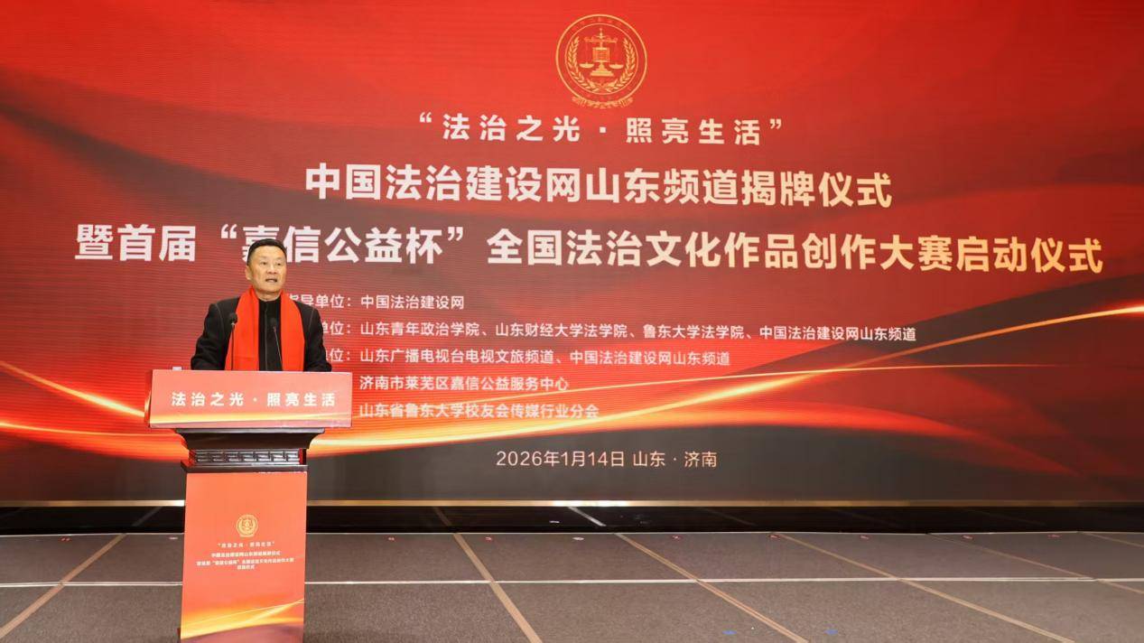 2026年1月14日上午,中国法治建设网山东频道揭牌仪式暨首届“嘉信公益杯”全国法治文化作品创作大赛新闻发布会在山东大厦齐鲁厅隆重举行。活动以“法治之光,照亮生活”为主题,汇聚各界领导、法学专家、媒体代表百余人,共同见证法治文化与传播平台深度融合的重要时刻。