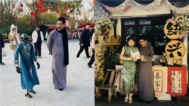 每每行走于白墙黛瓦之间,便有游客举起手机,将他的风姿录成视频,传至网络。镜头中的他,举手投足间流淌着浓浓的“老绍兴的韵味”,这份纯粹与地道,很快便收获数百万点赞,悄然成为一方“文化网红”,也将汩汩流量,引向了钱大姐的汉服店。