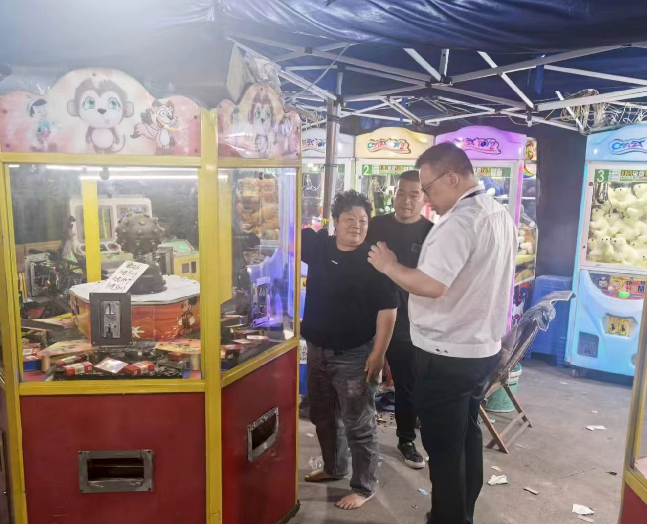 (图为该局执法人员正在监管游戏机售烟乱象。张航/摄)