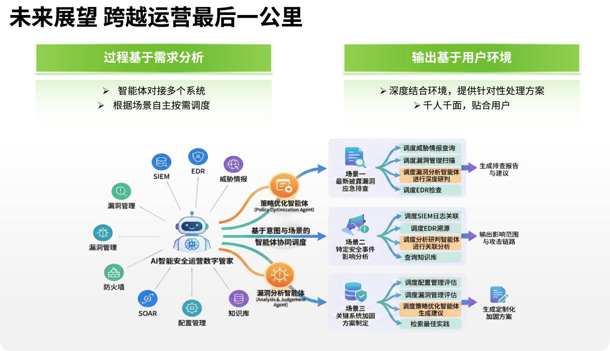 基于此,绿盟科技描绘了面向未来的 “安全数字人”愿景——一个能够理解不同角色(如工程师、管理者、业务人员)自然语言需求,自主调度后台智能体,交付个性化解决方案的智能交互入口,旨在彻底跨越安全运营的“最后一公里”。