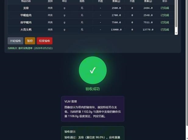 装置最核心的变革在于业务流程的再造。借鉴快递驿站“放置即出库”的自动化理念,小组设计了“清单驱动”的强制闭环核验流程。验收人员只需将食材放置在装置上,系统便自动完成重量读取、图像采集、VLM识别、订单匹配、误差判断,直至生成带有电子签章的验收报告,全过程无需人工干预屏幕或核对单据。