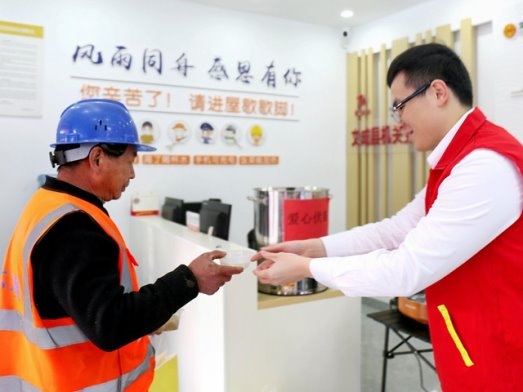 (图为志愿者为户外劳动者端上冬至汤圆。刘一心/摄)