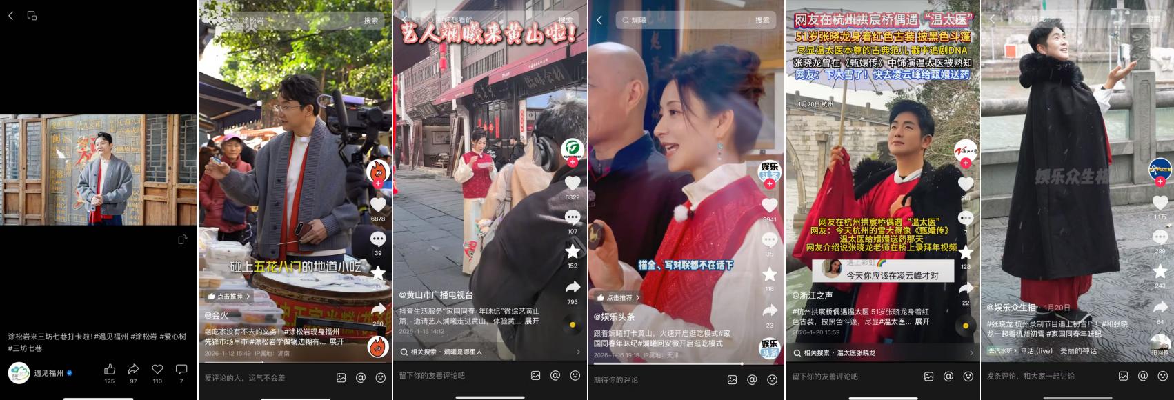 回顾这个春节,大家感受到的年味不仅来自身边,也来自屏幕那端。抖音生活服务微综艺《家国同春年味纪》通过打造一场“寻味之旅”,带大家去到有着浓浓年味的地方“认真过年”,感受传统新年的热烈与美好。从烟火气满满的福州、有着徽风皖韵的黄山,再到诗意浪漫的杭州……整季节目通过多位艺人带头玩转不同城市,体验地域年俗文化,带观众过了一个“地道中国年”。