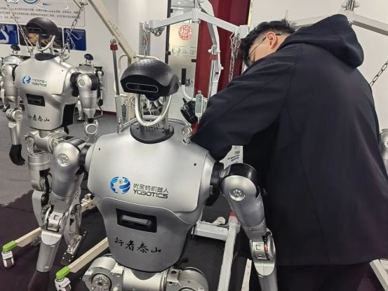 走进山东优宝特智能机器人有限公司,研发与生产节奏已全面拉满。算法实验区内,工程师们紧盯屏幕,指尖飞速敲击代码,对四足机器人的运动控制参数进行迭代优化,为新一代产品注入更强劲的“数字动力”。测试跑道上,型号为Y30的四足机器人正加紧练习新技能,一边优化算法,一边验证功能。装配工位上,人形机器人“行者泰山”的组装热火朝天,工程师们细致调试关节模组与感知系统,让钢铁骨架逐渐拥有能走、能看、能思考的“灵魂”。