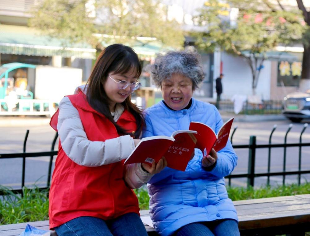 图为法务管理员王琪(左)在社区向老年人宣传《中华人民共和国民法典》,并提醒防范电信网络诈骗