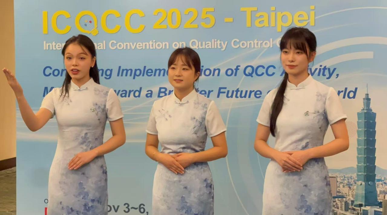 图为女职工王琪、曹春潮、周清雨在国际质量管理小组大会上发布成果