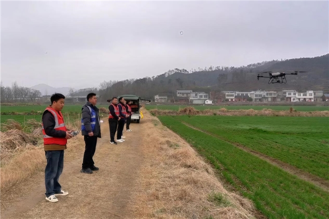 大悟县地处鄂北山区,传统的人工施肥方式劳动强度大、效率低,且容易造成踩踏伤苗。如今,这一局面正在被科技彻底改变。全县种植有小麦16.4万亩、油菜15.3万亩,春管高峰期,数十台植保无人机穿梭于田野上空,成为春耕生产的“新主角”。