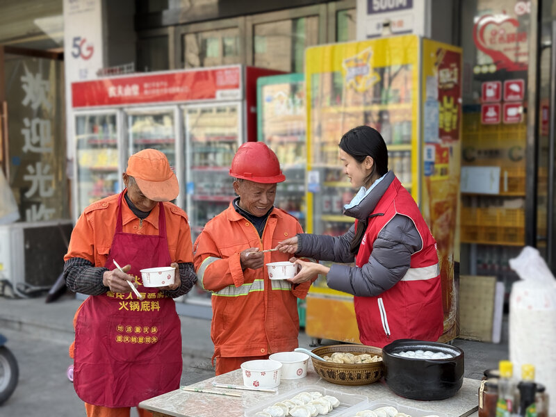 图为志愿者在社区小中心门外为户外工作者送饺子