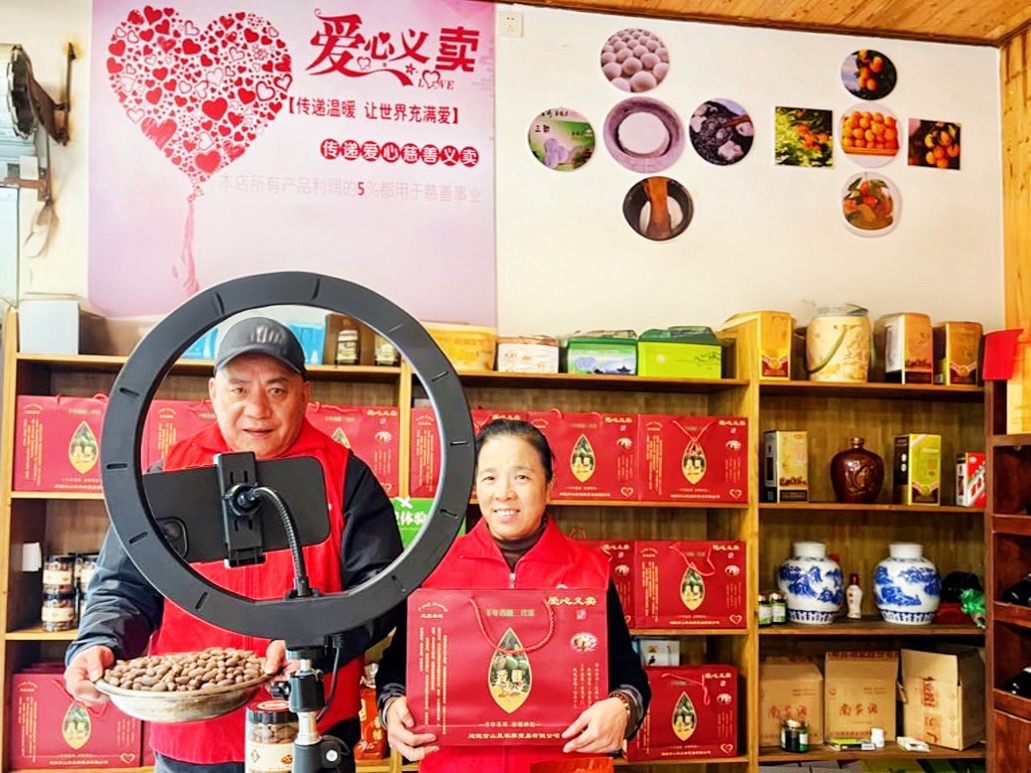 2023年,“香溢”志愿者把直播设备搬进了小中心。镜头前,店主朱冬囡略带羞涩地介绍店中助农专柜上的土特产品。