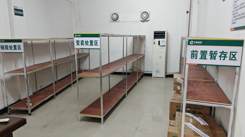 同时,仓库内部的空间规划也极具科学性。首先,设立了专门仓库,将罚没卷烟与罚没电子烟等特殊烟草物品分开存放,针对其不同特性进行分类管理。其次,根据处置进度,在库内清晰划分了三大功能区:前置暂存区:如同“观察室”,用于存放尚未确认罚没性质的涉案物品,如先行登记保存的物品,体现了程序的严谨;罚没变卖处置区:如同“待转站”,用于存放确认变卖处置的正规卷烟,确保国家财政收益的顺利实现;罚没销毁处置区:如同“终结场”,用于存放待销毁的假冒伪劣、走私、霉变等卷烟,守护消费者健康和市场秩序。
