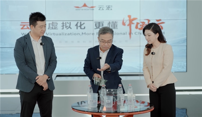 (云宏信息科技股份有限公司副总裁涂华奇以矿泉水比作算力资源,展示云宏虚拟化软件的工作原理)