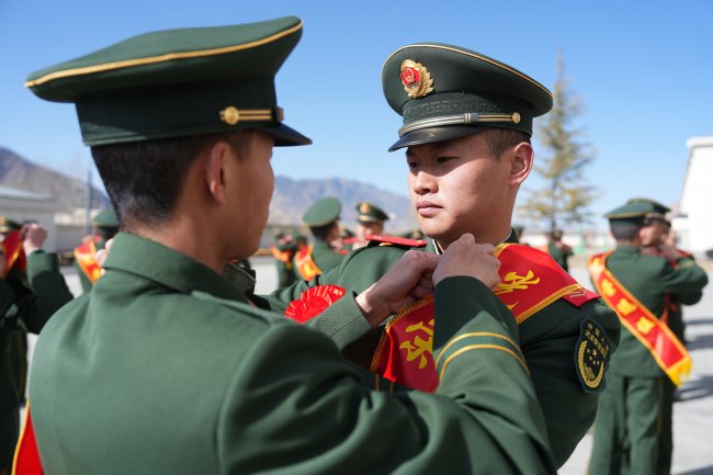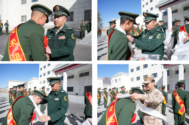 仪式开始前,支队常委领导和送兵干部为全体退役士兵敬献洁白吉祥、寓意圣洁与祝福的康巴哈达。