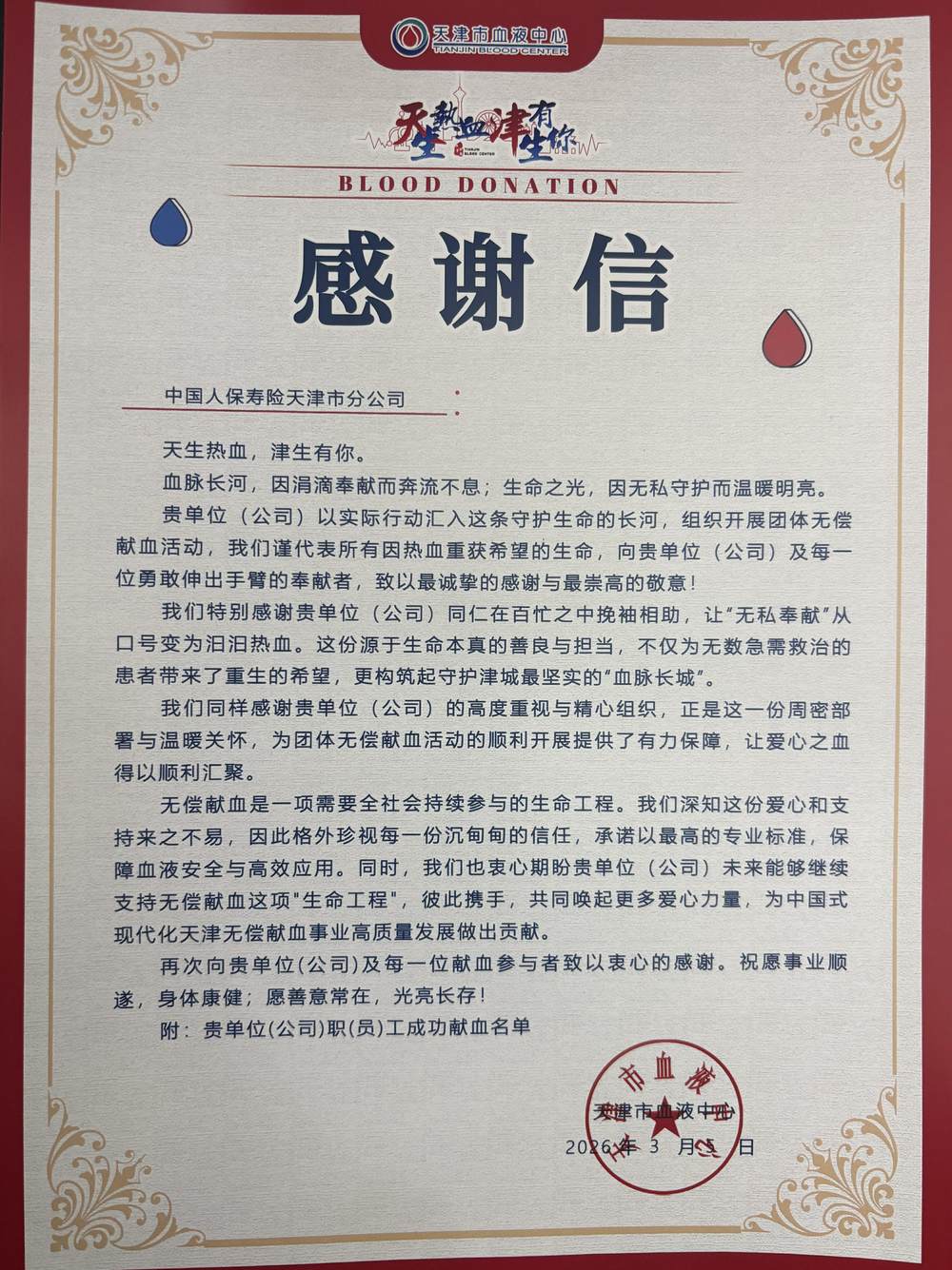 此次献血行动得到天津市血液中心高度认可,发来感谢信,对人保寿险天津市分公司积极履行社会责任、员工无私奉献的行为予以诚挚感谢和充分赞扬。