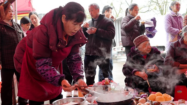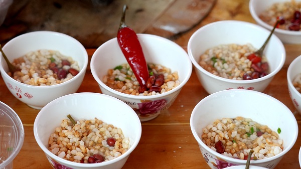 “茶嘎奶奶茶嘎婆,端起瓶子话头多;一日三餐打油茶,没得油茶睡不着。”这首在顺溪村广为流传的民谣,道出了村民们对油茶的深厚情感。比赛现场,来自各屯的“茶嘎奶奶”和巧手媳妇们纷纷亮出绝活,从炒制、捶打到熬煮、调配,一招一式尽显传统技艺的精髓。铁锅翻炒的沙沙声、木槌敲击的清脆声此起彼伏,鲜茶叶、老姜、大蒜、绿豆在巧手中交融升华,一碗碗色泽金黄、香气四溢的灌阳油茶接连出锅,引得现场观众频频点赞。